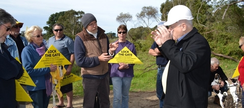 [Image: locals confront Lakes Oil with their concerns, at their drill site at Seaspray]