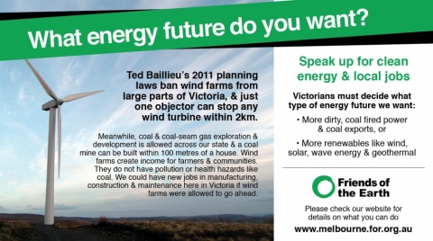 Ted Baillieu’s 2011 planning laws ban wind farms from large parts of Victoria, and just one objector can stop any wind turbine within 2km.