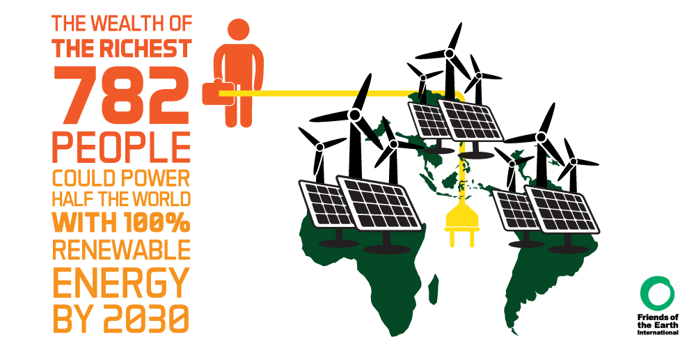 The personal fortunes of the 782 wealthiest people on the planet, many CEOs of major corporations, could power Africa, Latin America and most of Asia with 100% renewable energy by 2030, said Friends of the Earth International in a new report released today. [1]